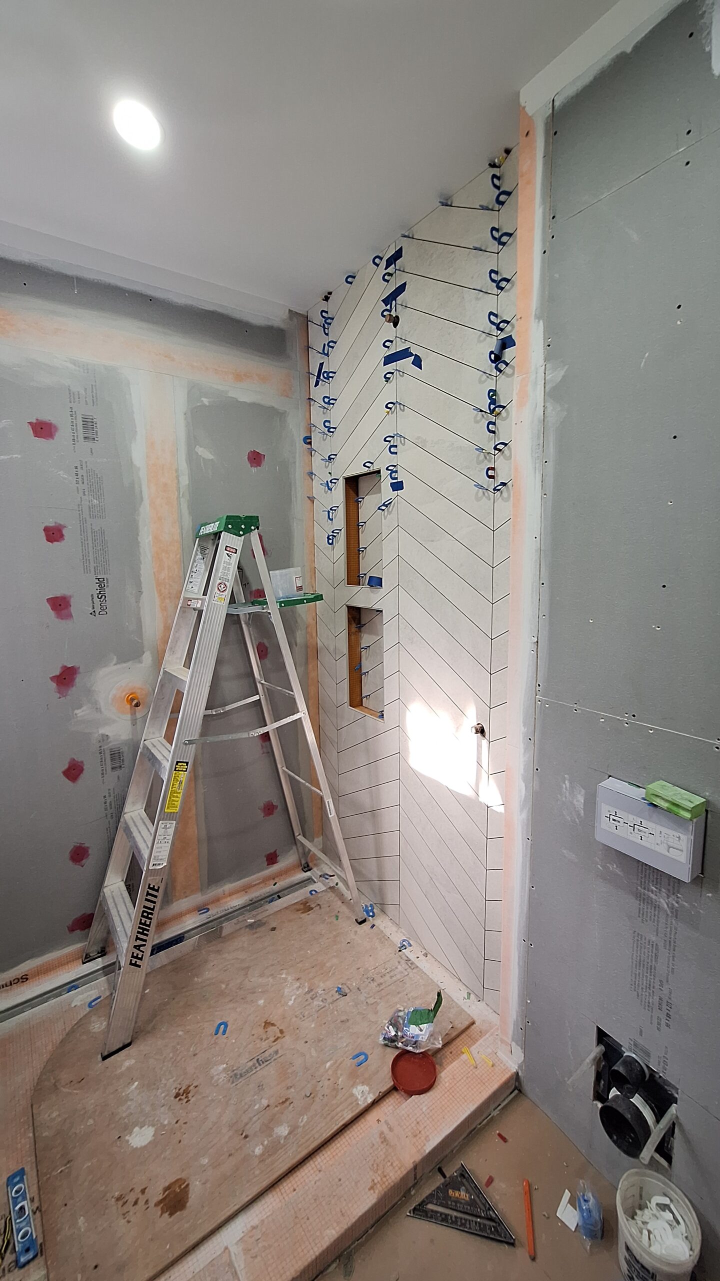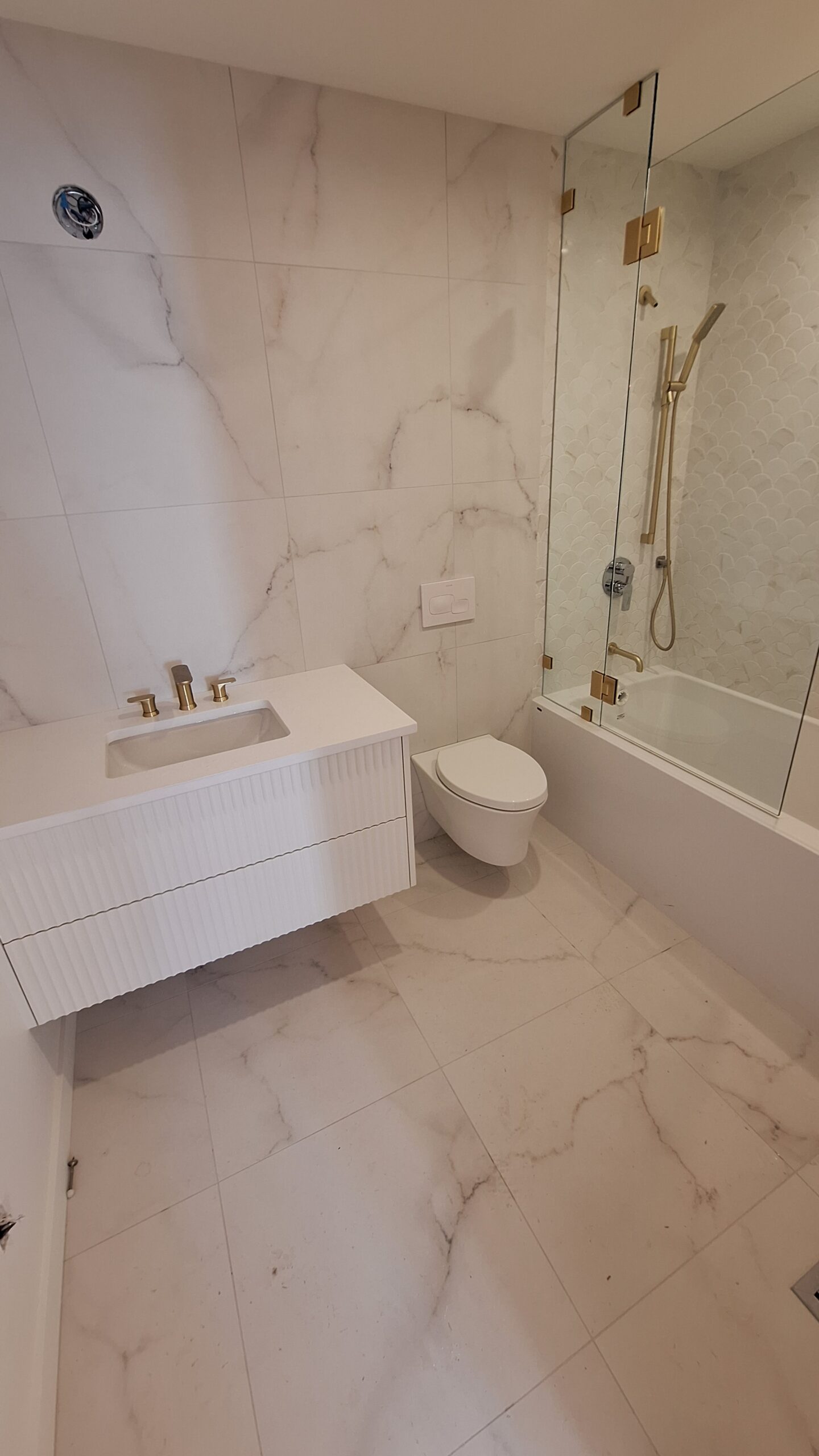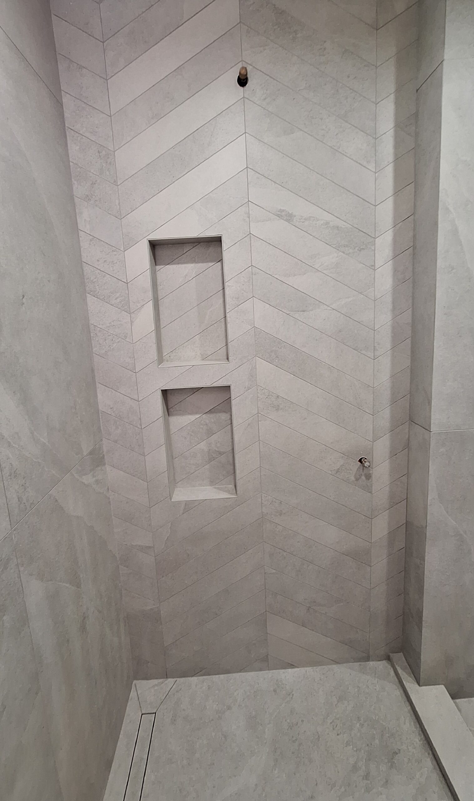 We’re thrilled to share details of a recent subcontracted project where we had the pleasure of transforming three luxury bathrooms and a powder room through expert tiling. This undertaking involved working with some of the finest quality tiles sourced from Julian Tiles, allowing us to incorporate a diverse range of formats, from impressive 36″x36″ and 24″x48″ large format tiles to delicate fish scale tiles and striking black hexagons with gold veining. Our team’s commitment to precision was paramount throughout the installation process. Every tile was carefully placed, with particular attention paid to achieving perfectly executed mitered corners, ensuring a seamless and contemporary aesthetic. The master bathroom served as a highlight, where we installed a captivating feature wall with elegant chevron tiles and created two oversized niches, each showcasing a perfectly matched tile background for a truly luxurious and cohesive look. This project exemplifies our dedication to delivering the highest standard of tiling craftsmanship for sophisticated spaces.